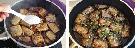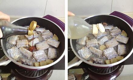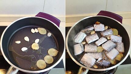 2.平底不粘鍋燒熱,倒少許油,下如蒜姜片煎出香味,下入帶魚段,開大火煎至兩面金黃(煎好一面再煎另一面,不要反復翻動)噴入適量料酒,倒入適量醬油和米醋(我這里大概放了10克料酒,40克醬油,30克米醋),再加入50克熱開水,開大火煮帶魚,搖動幾下鍋子,撒上一層白砂糖(大概15克)用筷子或者鏟子將帶魚每個都輕翻一下面,再次晃動鍋子,使帶魚整個包裹上糖醋汁,見到湯汁變很濃稠,關(guān)火,撒上蔥花,出鍋裝盤