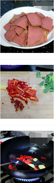1. 鹵牛肉切片,紅椒切大丁,生姜切片,大蒜葉切長段,干尖椒剪好備用