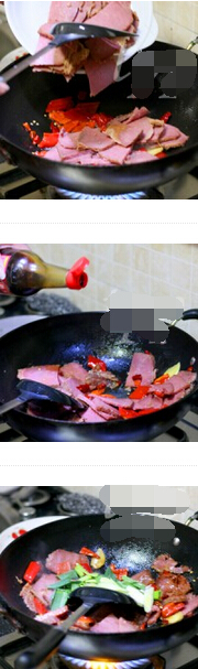 2. 炒鍋倒適量油,下入姜片,干尖椒,紅椒,加小半勺鹽,炒香,下入牛肉翻炒,加少量老抽,雞精,胡椒粉,少量水,翻炒均勻,最后加入蒜葉,翻炒幾下即可出鍋了