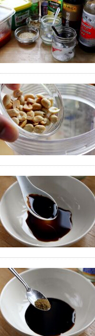 1.備好自制番茄醬、黃豆醬、芝麻、花生、五香粉、孜然粉、油、鹽、糖、老抽和生抽。