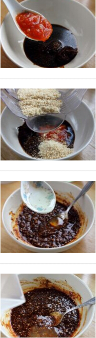 自制燒烤醬的材料:花生仁15克,白芝麻5克,黃豆醬1小勺,老抽1湯勺,生抽1湯勺,食物油1湯勺,精鹽1/2小勺,番茄醬1湯勺,五香粉1/3小勺,孜然粉1/4小勺,糖2小勺,生粉1/4小勺,水