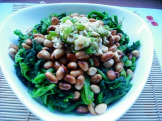 9 上桌前倒入調(diào)好的料汁,一盤香辣、甜、酸適口的菠菜拌花生米一會功夫就落入我們一家三口的腹中。