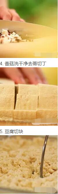 3. 香菇洗干凈去蒂切丁,豆腐切塊,放在盤子里壓碎
