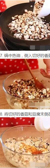5. 將切好的香菇和豆腐末倒在一起攪拌均勻,加一勺生抽、半勺香油、一茶匙鹽攪拌均勻