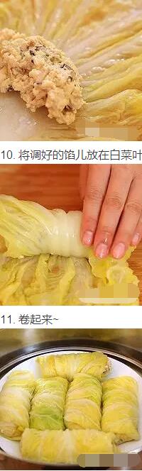 6. 將調(diào)好的餡兒放在白菜葉上,卷起來碼在盤中