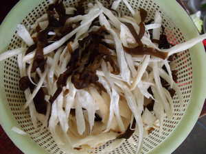 1 杏鮑菇用手先掰盛四瓣,然后撕成絲。木耳切絲。