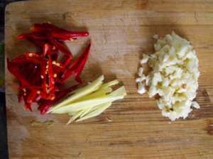 2 姜切絲,干辣椒切絲,蒜拍碎輾一下。