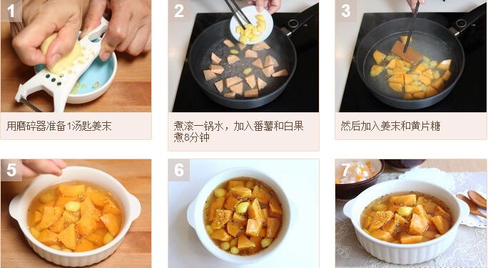 桂花白果番薯糖水的材料:番薯350克,白果20克,姜20克,黃片糖80克,桂花5克,水1L