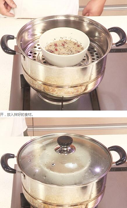 2. 蒸鍋中注入適量清水燒開,放入拌好食材的小碗,加蓋,大火蒸20分鐘轉(zhuǎn)小火蒸2小時至食材熟透。