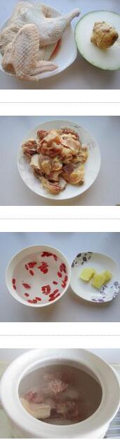 冬瓜燉土雞的材料:冬瓜300克,土雞半只,鹽,枸杞30個(gè),姜5克,料酒2 茶勺,