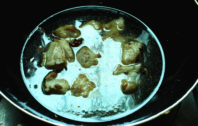 9、待肋排炒至兩面金黃,倒入適量清水,以剛好沒過排骨為宜