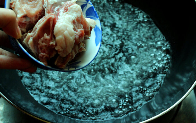 3、鍋內(nèi)置適量清水,待水沸以后,倒入肋排,焯一小會兒至變色