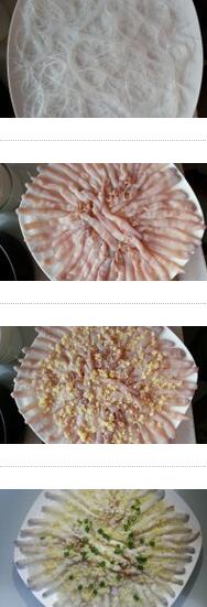 3.把泡軟的粉絲撈出擺在盤中,把洗干凈的沙蟲整齊的擺在粉絲上,把調(diào)好的蒜蓉配料均勻的撒在沙蟲上學(xué)做菜