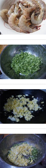1.明蝦洗凈,去殼,黃瓜擦成細(xì)絲后用刀切碎備用,雞蛋炒成蛋花,切碎備用