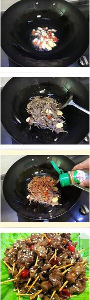 5.鍋里留少許底油,放入姜蒜辣椒炒出香味,然后倒入牙簽牛肉炒均勻,如果味道太淡可再加入適量的生抽拌勻,然后再加入辣椒粉、孜然粉拌勻既可關(guān)火,出鍋前撒入熟芝麻就好了