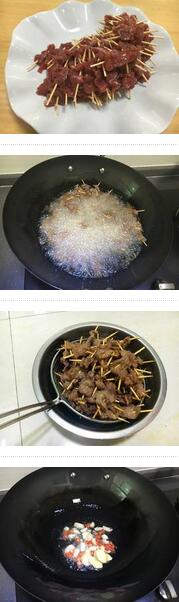 4.坐鍋倒油燒熱,大概油溫燒到七成熱時倒入穿好的牙簽牛肉炸1分鐘,一分鐘后,撈出瀝干油分備用。