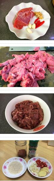 牙簽牛肉的材料:牛肉350-400g,一塊,蒜瓣3瓣,小米辣椒4個,生抽2勺,蠔油1勺,料酒1勺,鹽,淀粉(生粉),胡椒粉,辣椒粉,孜然粉,白芝麻(熟),食用油