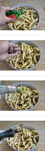 2. 4小時后,倒出腌出來的水,倒入高度白酒,少許花椒,倒入白醋,姜芽、白醋的比例是10:1,倒入少許醬油,增色,按照姜芽、白糖10:1的比例倒入白糖,還可灑入紅辣椒、大蒜片,或者倒入蒜泥,拌勻后裝進(jìn)干凈無油的容器里,腌漬一周即可食用。學(xué)做菜