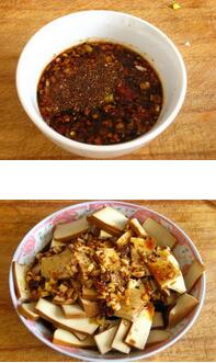 2.把蔥姜蒜末放入碗中加上辣椒油,醋,醬油,香油,麻椒粉,糖調(diào)料拌勻后澆到香干上,再繼續(xù)拌勻就好了