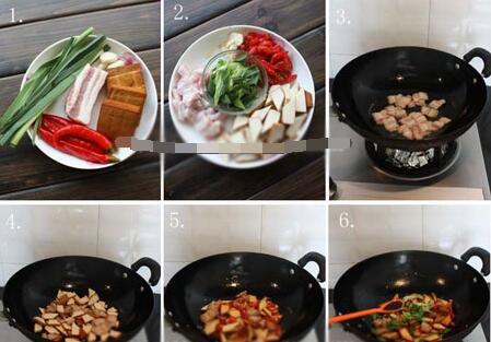 2.坐鍋倒少許油,下入五花肉,炒至出油后下入香干、大蒜片,炒至香干表面微微變黃;再下入泡椒、鹽、糖,翻炒兩分鐘(此時如覺得太干可放入少許水燜一下);后下入蒜苗,放入生抽,炒勻就可以了出鍋。美食網(wǎng)