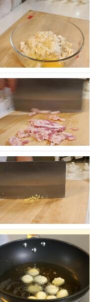 3.坐鍋倒油大概300g左右,大火燒至五六成熱,把調(diào)好的豆腐餡,用小勺弄成小橄欖形,放入鍋中,炸至金黃色撈出,控油備用。
