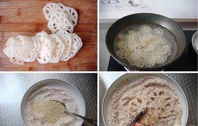 2、辣椒粉、椒鹽、白胡椒粉、黑胡椒碎、淀粉、白芝麻混合均勻后將汆燙好的藕片放到混合好的粉中均勻裹上粉;