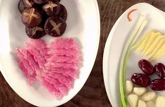 1.香菇去根、切出花刀。青蘿卜、白蘿卜切塊備用;