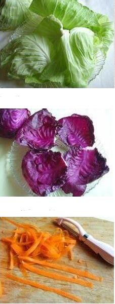 1.綠包菜成片剝下,紫甘藍(lán)成片剝下,胡蘿卜刮成長薄片