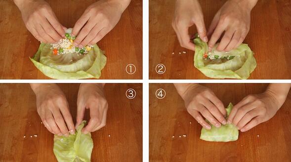 4.燙好的包菜將葉片撥下來后包入調(diào)勻的糯米餡料,一個包菜卷里可以放2個蝦仁的做法