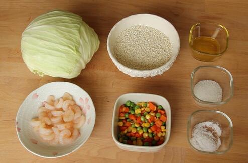 糯米蝦仁包菜卷的材料:包菜700g、糯米200g、蝦仁100g,玉米/胡蘿卜/豌豆100g,鹽10g、糖10g、橄欖油15g