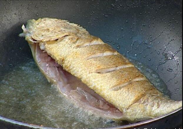 2 坐鍋放底油,將腌制好的黃魚下入鍋中進行煎制,一面煎至金黃后翻到另一面,兩面煎至金黃后將鍋中的油倒出去