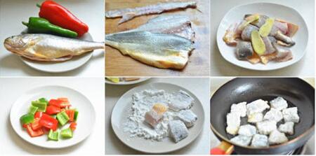 3.黃魚去鱗后洗凈控干,黃魚去除魚頭,然后黃魚橫向片開,剔除魚骨,魚肉切成大小相同的塊狀,加鹽,料酒,胡椒粉和姜片拌勻腌15分鐘,腌好的魚塊放在生粉沾一層生粉。