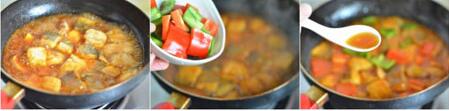 4.坐鍋倒油,油6成熱時(shí)將裹好生粉的魚塊放入,用中火煎至魚塊二面金黃,倒入調(diào)好碗汁,煮開后用小火燉10分鐘左右。加入青紅椒塊再加1小勺香油拌勻后即可出鍋。