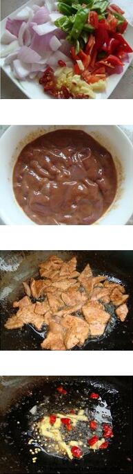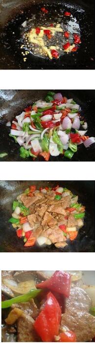 2.坐鍋倒油油燒熱將豬肝倒入快速翻炒,豬肝飽滿就趕快盛起,鍋里余油爆香干辣椒,生姜,下洋蔥,青紅椒翻炒,在配料快熟是倒入豬肝用鹽,少許生抽,胡椒調(diào)味,稍微翻炒就起鍋裝盤。