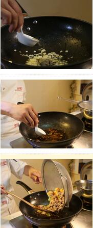 5.鍋留底油,下入蔥姜蒜爆香,下入黑胡椒炒出香味,加蠔油炒香后放料酒,少許清水,放老抽,加鹽、味精、雞粉、白糖,大火燒開,用水淀粉勾芡調(diào)成汁,倒入鴨丁、土豆丁、青紅椒丁,大火翻炒幾下出鍋裝盤。