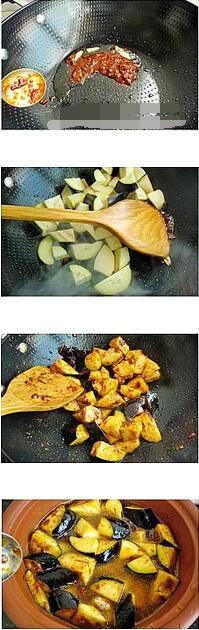 3.鍋留底油放入一勺黃豆醬炒香,倒入土豆和茄子翻炒至茄子有些變軟,倒入沙鍋中,加入清水,一點(diǎn)老抽,糖,大火煮開中火燉煮10分鐘后把豆角和洋蔥放入,繼續(xù)大火煮直到豆角變軟。
