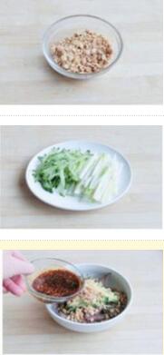 4.把料汁、五香花生打碎、黃瓜絲、蔥絲到入碗中調(diào)勻即可