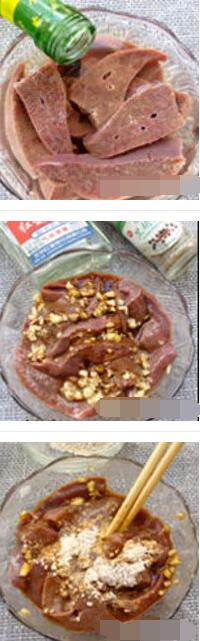 2、豬肝放入碗中依次放入:蒜蓉,姜末,一勺老抽,2勺生抽,白酒,胡椒粉,1/2勺糖,五香粉,腌制一刻鐘。