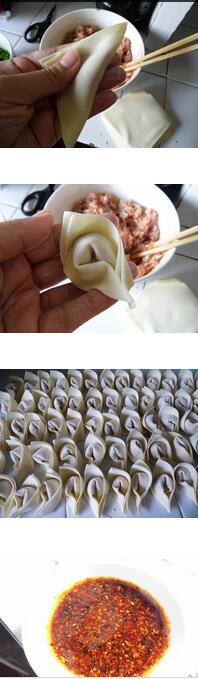 3、將肉餡包入餛飩皮,包成抄手元寶狀;