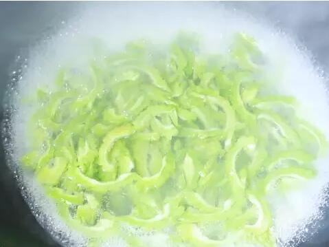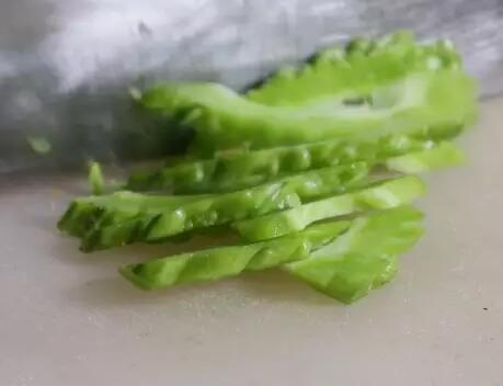 1、苦瓜去頭尾,從中破開(kāi)去籽,洗凈改刀切片