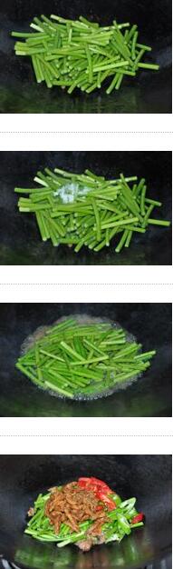 4. 鍋內(nèi)少許底油燒熱,放入蒜苔翻炒片刻再加入適量的食鹽,翻炒,再加入適量的水,稍煮片刻,待水差不多收干了,放入肉絲和青紅辣椒翻炒即可。