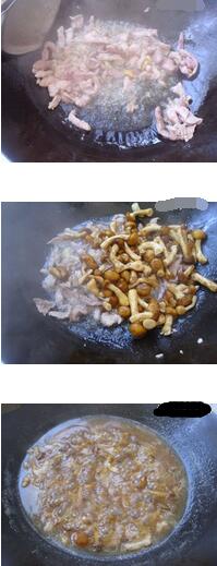 2.坐鍋倒油油熱后,炒香蒜頭再加入瘦肉翻炒待瘦肉變白后加入滑子菇翻炒一會再加入少許鹽,適量生抽和水,燒開,在燒入味后加入蔥段即可。