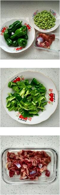 雞雜毛豆的材料:辣椒5-6只,毛豆300克,雞雜雞胗、雞肝、雞心各1個(gè),生,料酒,鹽