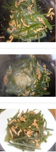 2. 鍋中放油,加入肉絲翻炒,加入海帶絲,加鹽繼續(xù)翻炒,可以適當(dāng)?shù)募狱c(diǎn)水,炒熟出鍋即可