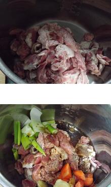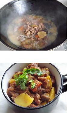 2.肉放鍋內(nèi)加水,沒(méi)過(guò)牛肉,加除鹽外的所有調(diào)料入鍋,先大火燒沸轉(zhuǎn)小火慢慢燉至肉熟,加土豆繼續(xù)燉至肉軟爛后加番茄,出鍋前加鹽調(diào)味即可