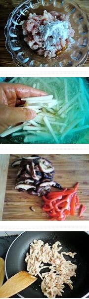 山藥炒肉絲的材料:山藥300g,里脊肉200g,香菇8朵,紅椒,蔥,鹽,料酒10g,糖3g,胡椒粉1g,雞精1g,淀粉,香,山藥,肉絲