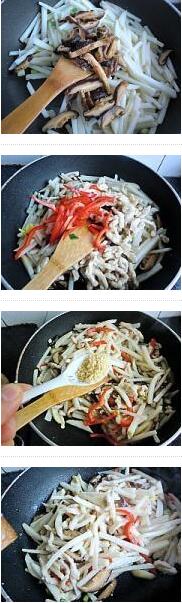 2..炒鍋到油燒熱倒入肉絲翻炒至變色盛出備用,鍋中再稍加一點(diǎn)油爆香蔥姜,倒入山藥翻炒均勻,加入鹽翻炒,再加適量的白糖,把香菇倒入加入少許清水燒煮片刻,放入炒過(guò)的肉絲和紅椒絲翻炒均勻,加少許雞精,最后淋入少許香油出鍋