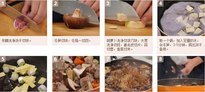1.羊腩洗凈瀝干切塊。冬筍切塊,冬菇一切四。胡蘿卜洗凈切滾刀塊,大蔥洗凈切段,姜去皮切片,蒜切蓉,香菜切末。