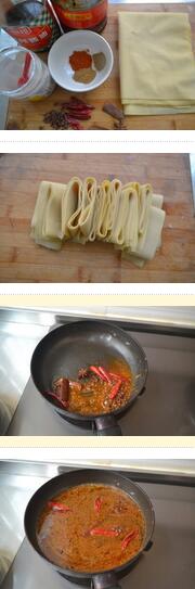 2.熱鍋涼油爆香,三種混合粉,和其余的香料,加入生抽,老抽,糖,開水做成汁子,加鹽和雞精調(diào)味,倒入豆皮,小火煮上15分鐘,泡在里面就好。