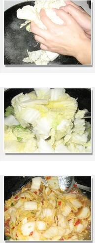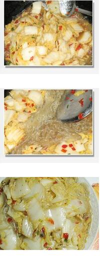 3.鍋中放底油,油熱,放姜絲,蔥花,剁碎辣椒,爆香一下。倒入焯好水的白菜,加鹽煸炒,使白菜癟下去,加點(diǎn)醬油,醋,然后蓋蓋子燒個(gè)1分鐘,然后加泡好的粉絲,不用刀切段了,倒入鍋中,自己用鍋鏟把粉絲粉兩段就可以了。再加點(diǎn)鹽,味精,翻炒一分鐘就可以出鍋了